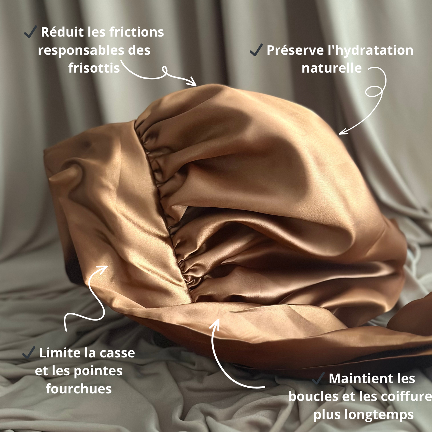 Assure-toi que tous les cheveux sont bien à l’intérieur. 👉 Le satin empêche l’évaporation de l’hydratation et protège des frottements.